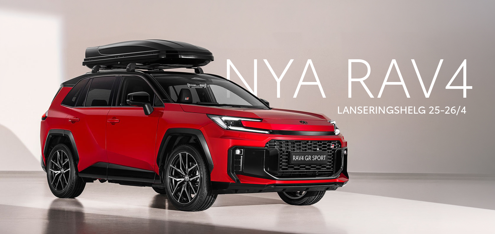 Bränsleförbrukning och CO2-utsläpp vid blandad körning enligt WLTP: 0,8-0,9 l/100 km, 15,1-15,3 kWh/100 km och 19-19 g/km. * Exempel med Toyota Easy Billån, 36 månader, kampanjränta 6,25%, 30% kontant/inbyte, baserat på 206.955 kr slutbetalning och 45% garanterat återköpsvärde och total körsträcka om max 4 500mil. Det garanterade återköpsvärdet är baserat på försäljningspris. Effektiv ränta 6,80%. Uppläggningsavgift och aviavgift tillkommer. ** Exempel baserad på fast ränta, 36 månader, 4.500 mil och garanterat restvärde. Kontakta en auktoriserad Toyota-återförsäljare för mer information. Erbjudandet gäller till och med 31 mars 2026. *** Köp en ny Toyota RAV4 under lanseringsveckan och få ett av tre tillbehörspaket till kampanjpris. 1. Serviceavtal BAS+ för 149kr/mån och lackförsegling. (värde 25.491kr). 2. Dragkrok och lackförsegling. (värde 19.400kr). 3. Takbox Biltrean Cargo Edition, lasthållare och lackförsegling. (värde 20.143kr). Erbjudandet gäller privatpersoner till och med 26 april 2026. **** De 60 första kunderna som köper en ny elbil (bZ4X, bZ4X Touring & Toyota C-HR+) under April månad får en gasolgrill från Weber till ett värde upp till 7.999kr utan kostnad. Kampanjen gäller privatpersoner till och med 30 mars 2026)